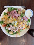 Mixed greens, cucumbers, tomato, red onion, diced ham, turkey & hard boiled egg topped with cheddar cheese & housemade garlic bread croutons with your choice of dressing.