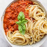 Al dente spaghetti with homemade marinara sauce topped with shaved parmesan, served with garlic bread.